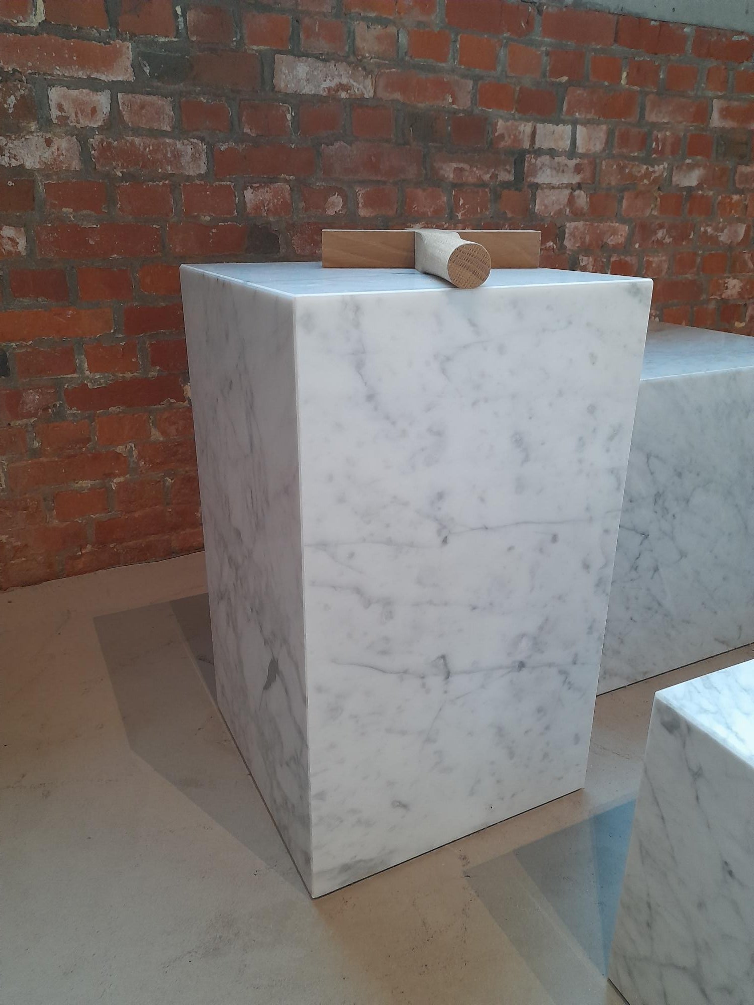 Bijzettafel in witte Carrara-marmer. Afmetingen: 30 x 30 cm x H 51 cm.